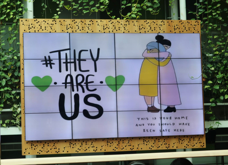 Arriving at AUT, I saw a big screen with a picture of a woman wearing hijab hugging a Maori woman and the writing said: “THEY ARE US. This is your home and you should have been safe here.”
