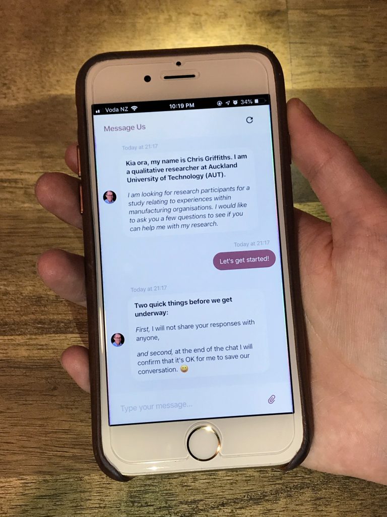 I developed this chatbot to help me recruit potential participants who are working within manufacturing industries. I ask questions that aim to highlight the suitability of the respondents. Potential participants will first hear about the opportunity to participate through an advertisement delivered through professional groups, unions, company intranets etc. The advertisement also includes a non-chatbot option for first contact. An approved Ethics Application, including recruitment process, is a prerequisite.