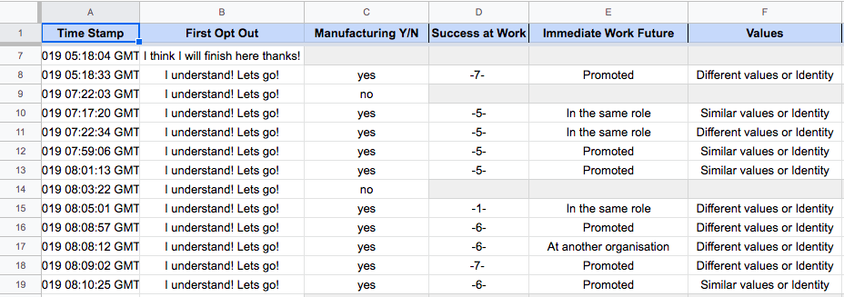 The chatbot also allows me to reach a larger pool of potential participants in a shorter time frame, compared to mail, intranets, noticeboards etc. The responses are saved directly to a spreadsheet and I am sent an email notification as soon as responses are received.