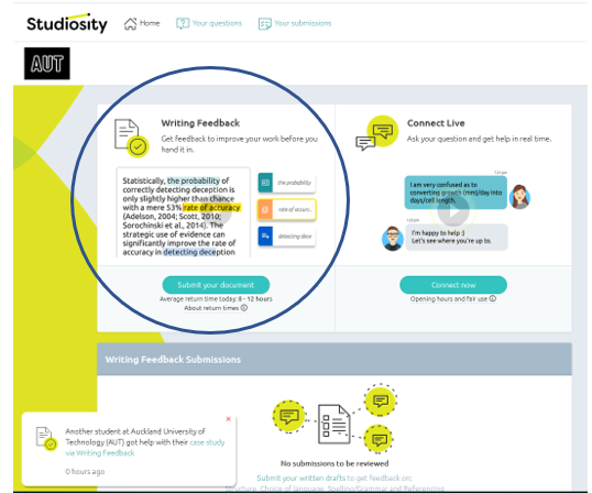 Have you heard about Studiosity? Studiosity is a great service that is available to all students at AUT, including research students. Studiosity offers two areas of support: subject support, and feedback on academic writing. While the level of subject support is unlikely to be specific enough for postgraduate researchers, the writing feedback is a service you may want to make use of. The feedback you receive is not on the subject matter of the writing, but around presentation issues such as clarity, structure, grammar and referencing.